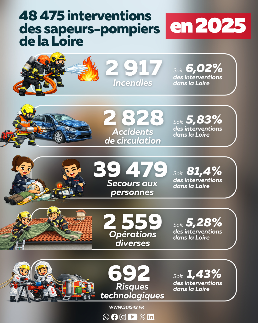 En 2025, l’activité opérationnelle des sapeurs-pompiers du département s’est maintenue à un niveau élevé, avec plus de 48 000 interventions réalisées par les sapeurs-pompiers de la Loire, dont plus de 80 % pour les secours d’urgence aux personnes.